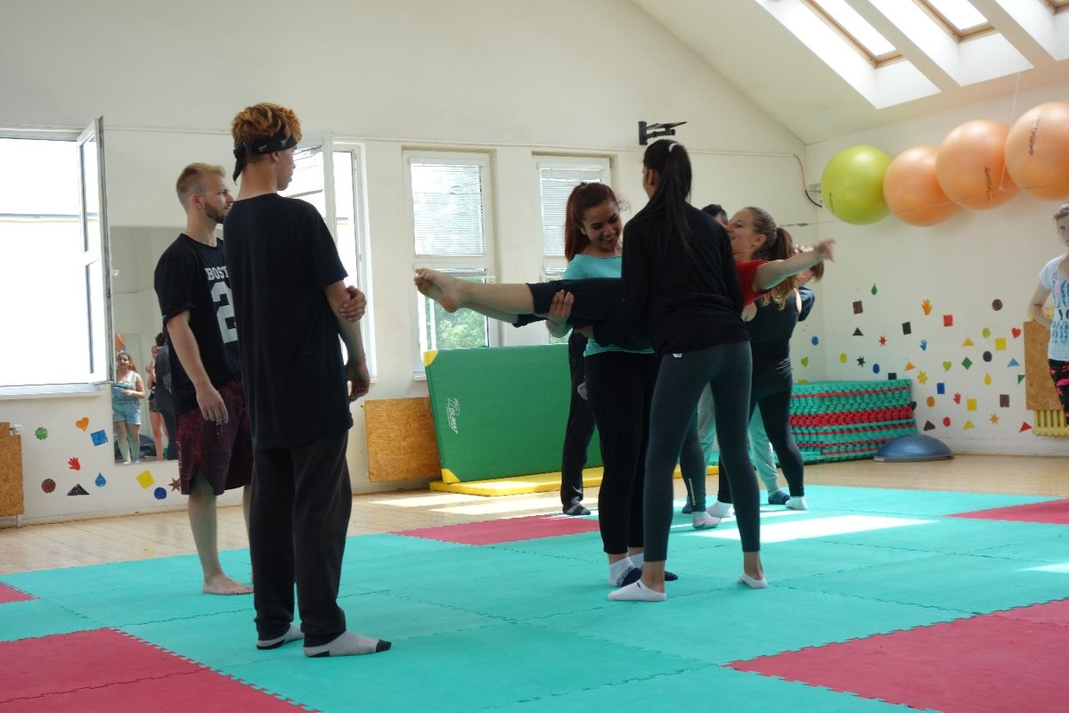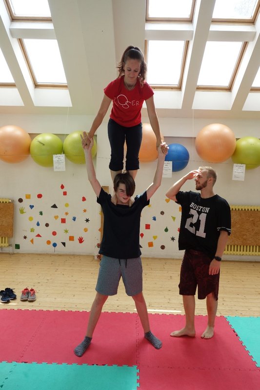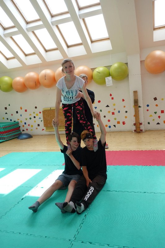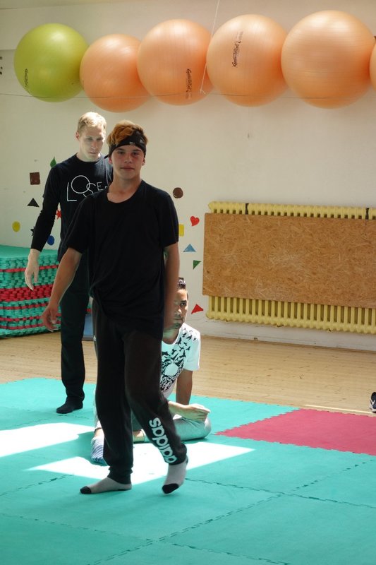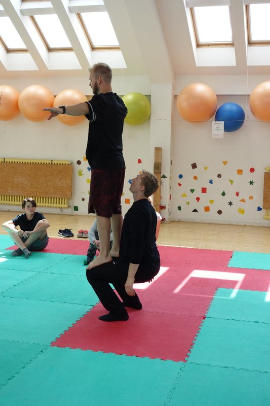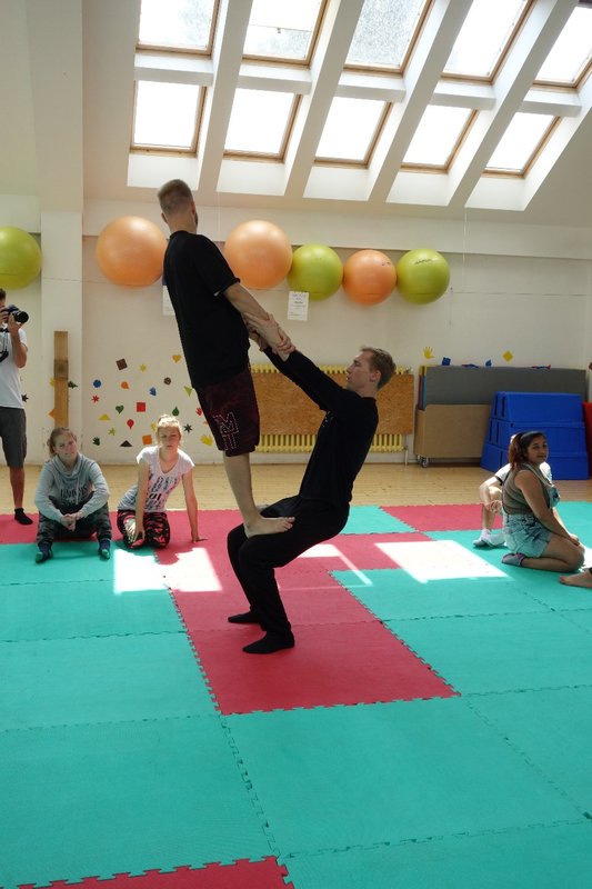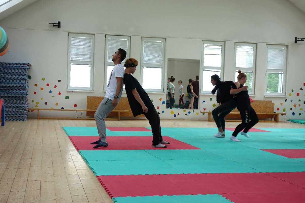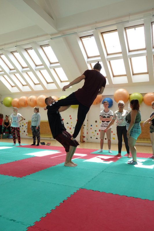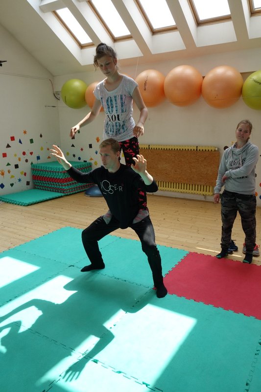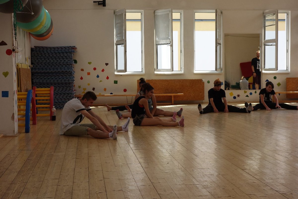 Očekávaný den D nadešel, účastníci z řad dětských domovů zdárně dorazili do Prahy a nadšeně se vrhli na své, nyní již známé, trenéry. Po bouřlivém přivítání následovalo krátké protažení a poté se již děti ponořily do víru tance, po kterém následovala akrobatická část. Ta se občas neobešla bez výkřiků některých děvčat a nutno dodat, že se ne vždy jednalo o výkřiky čisté radosti – občas v nich byla znát lehká obava a adrenalin, ale šikovní a trpěliví trenéři si poradili v každé situaci 🙂