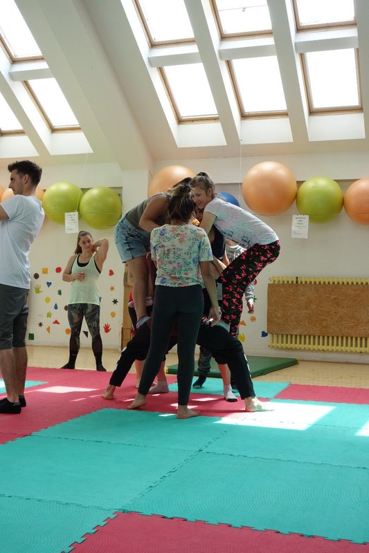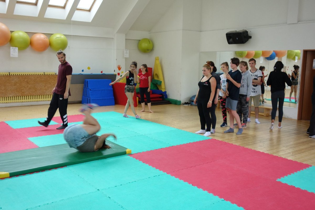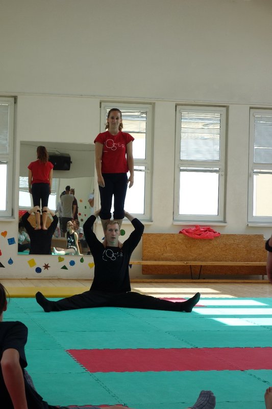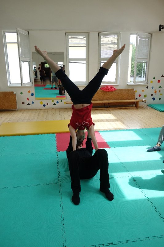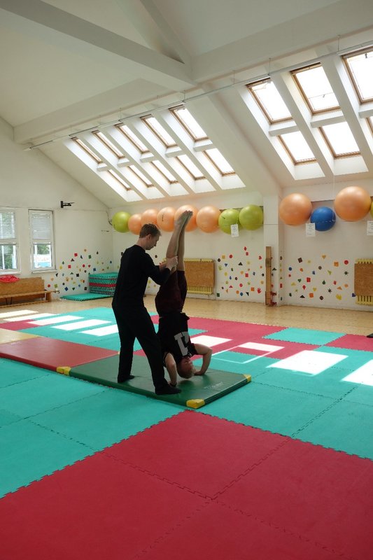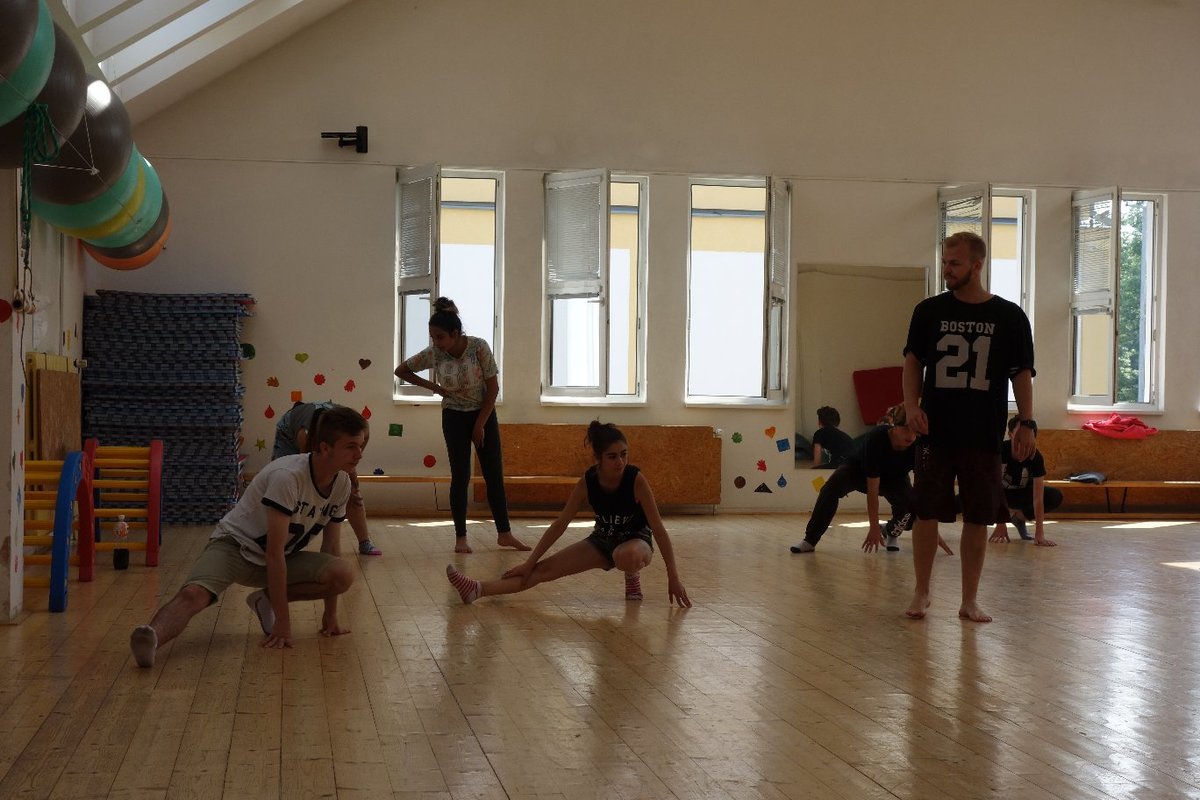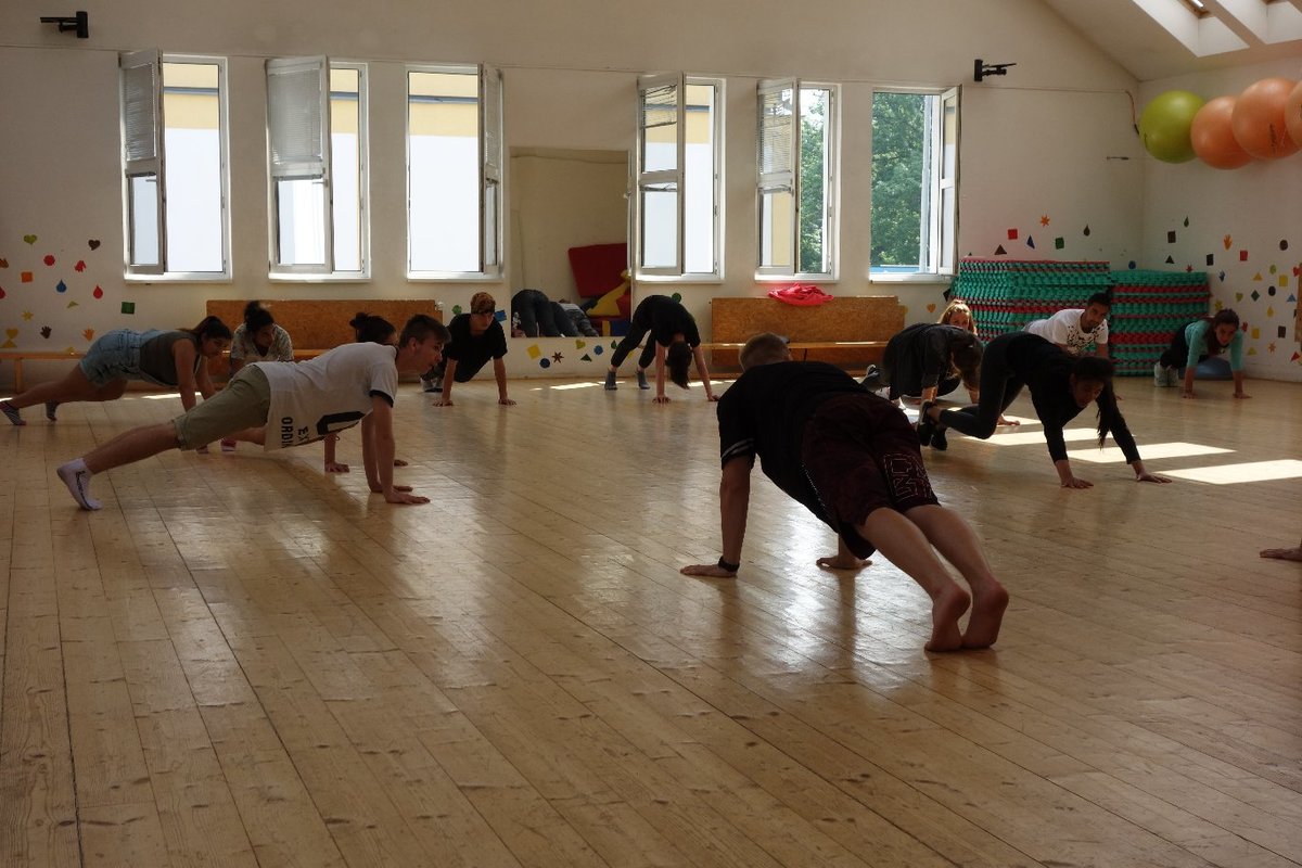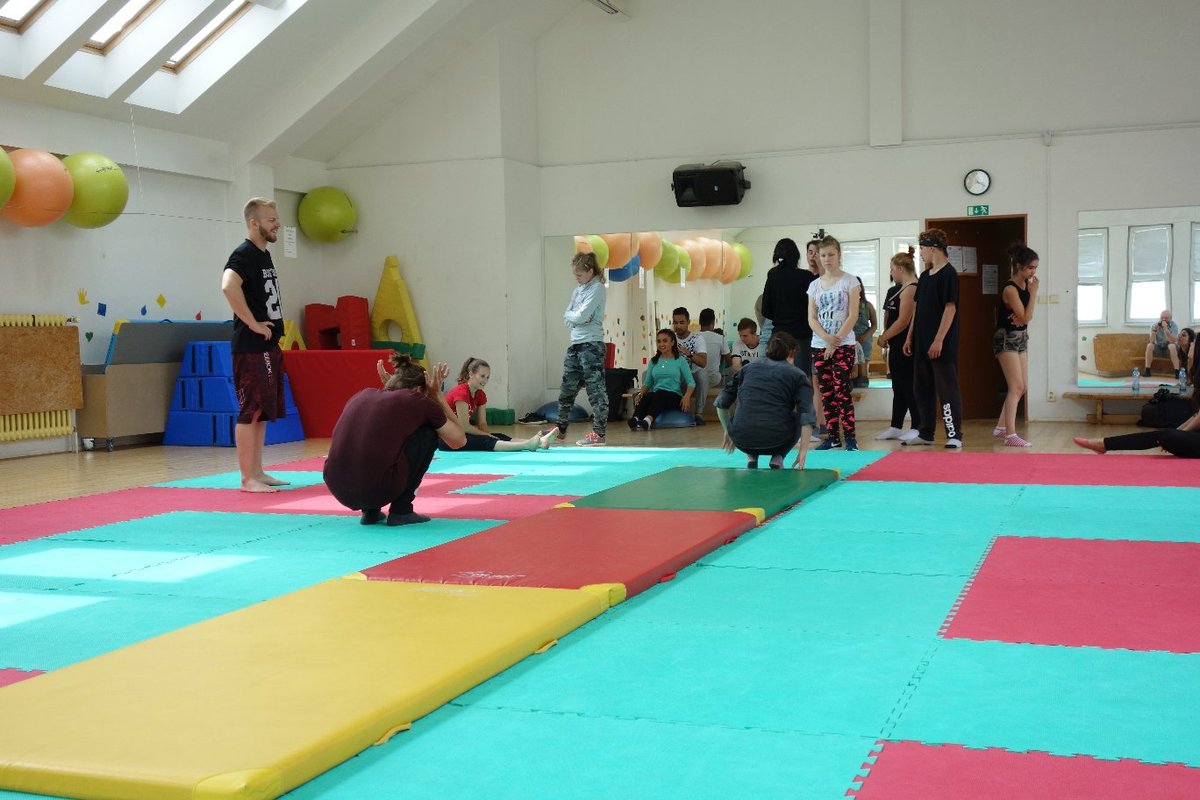 Očekávaný den D nadešel, účastníci z řad dětských domovů zdárně dorazili do Prahy a nadšeně se vrhli na své, nyní již známé, trenéry. Po bouřlivém přivítání následovalo krátké protažení a poté se již děti ponořily do víru tance, po kterém následovala akrobatická část. Ta se občas neobešla bez výkřiků některých děvčat a nutno dodat, že se ne vždy jednalo o výkřiky čisté radosti – občas v nich byla znát lehká obava a adrenalin, ale šikovní a trpěliví trenéři si poradili v každé situaci 🙂
