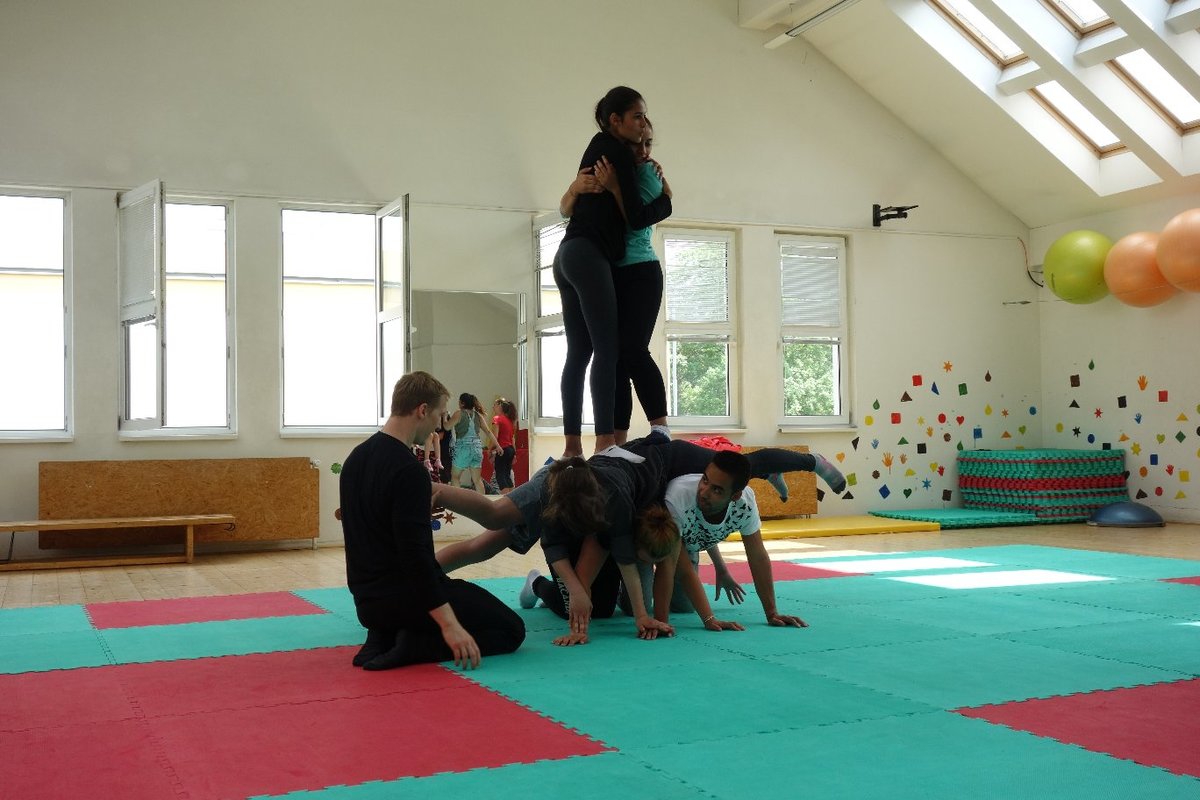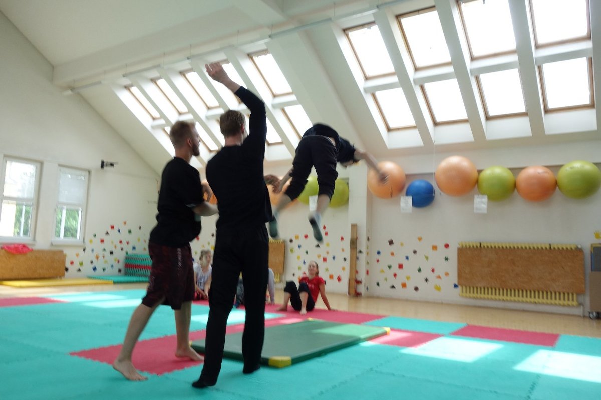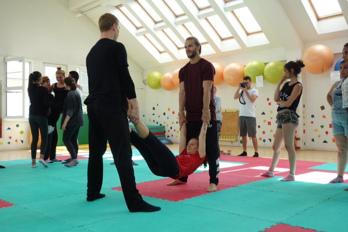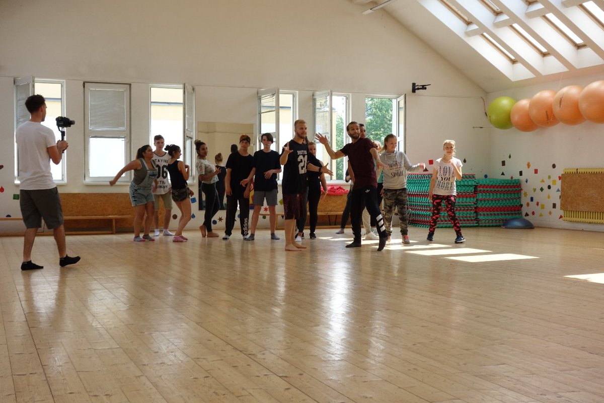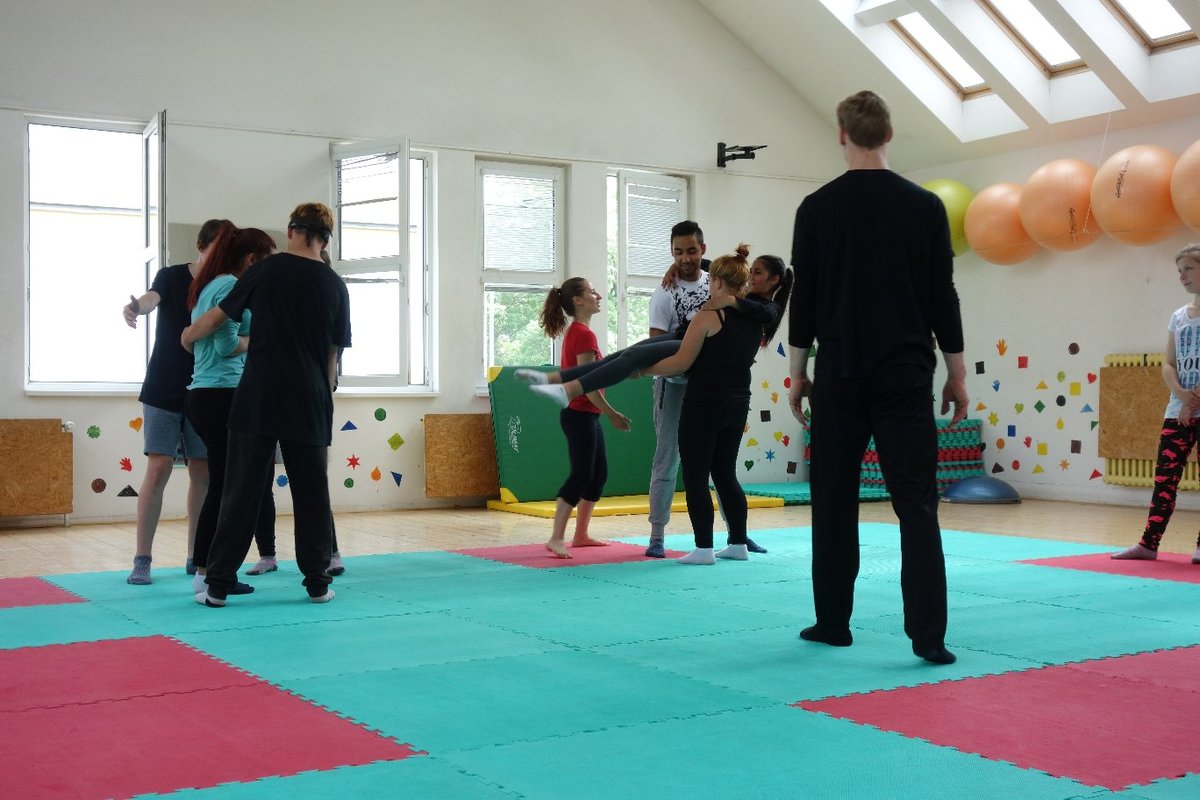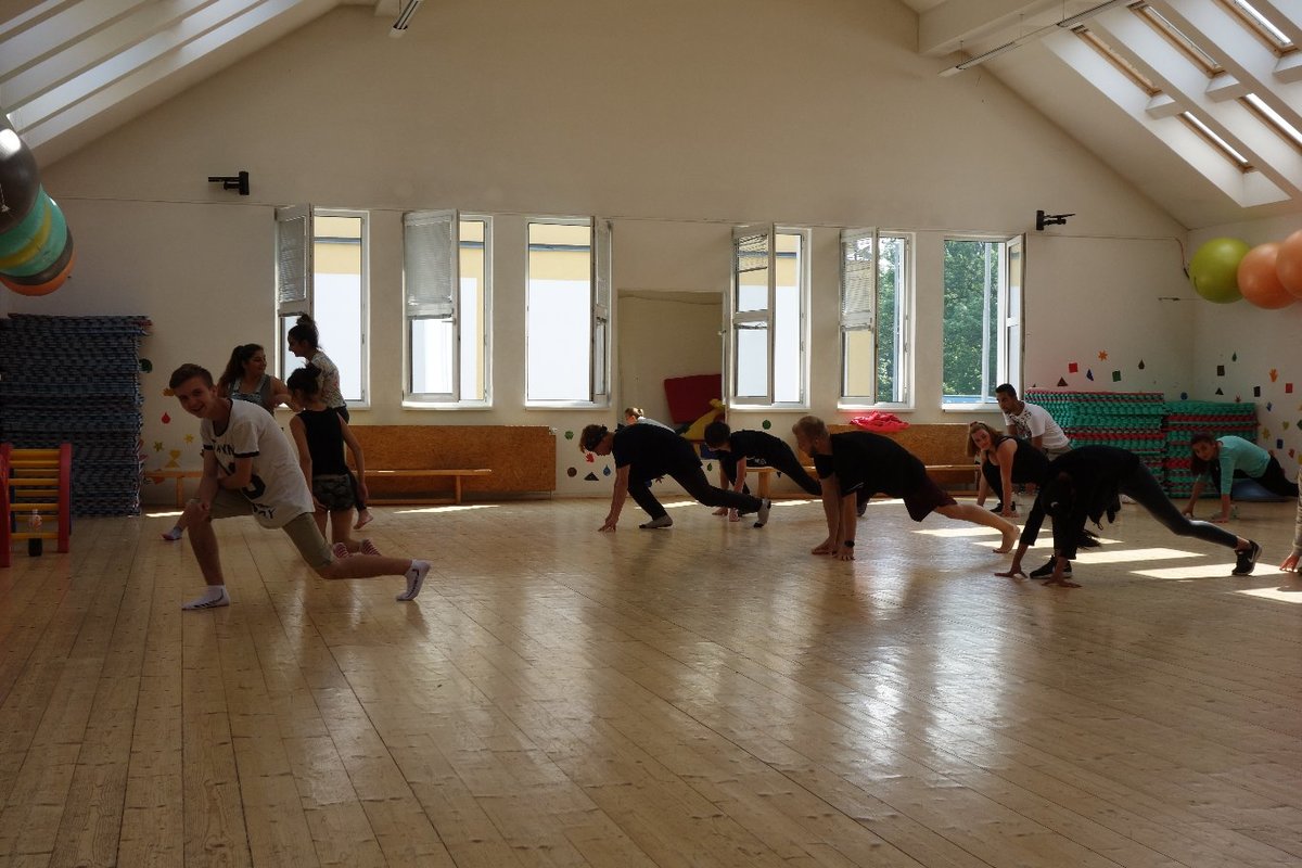 Očekávaný den D nadešel, účastníci z řad dětských domovů zdárně dorazili do Prahy a nadšeně se vrhli na své, nyní již známé, trenéry. Po bouřlivém přivítání následovalo krátké protažení a poté se již děti ponořily do víru tance, po kterém následovala akrobatická část. Ta se občas neobešla bez výkřiků některých děvčat a nutno dodat, že se ne vždy jednalo o výkřiky čisté radosti – občas v nich byla znát lehká obava a adrenalin, ale šikovní a trpěliví trenéři si poradili v každé situaci 🙂