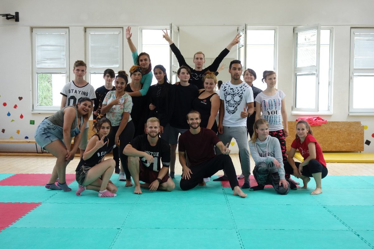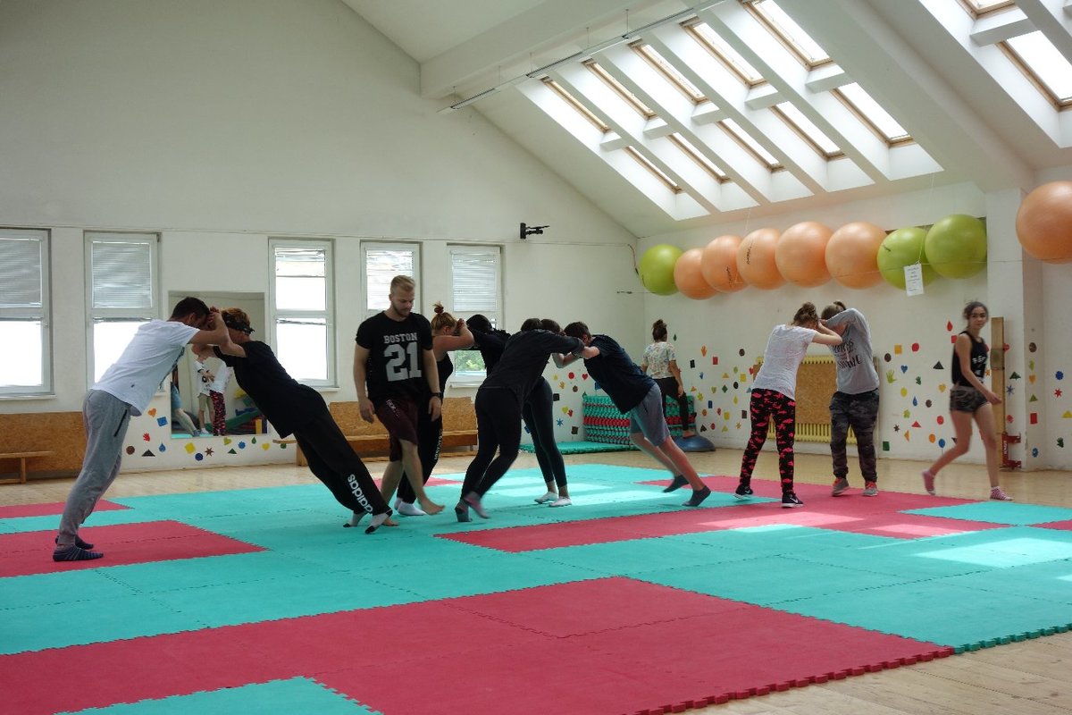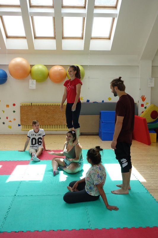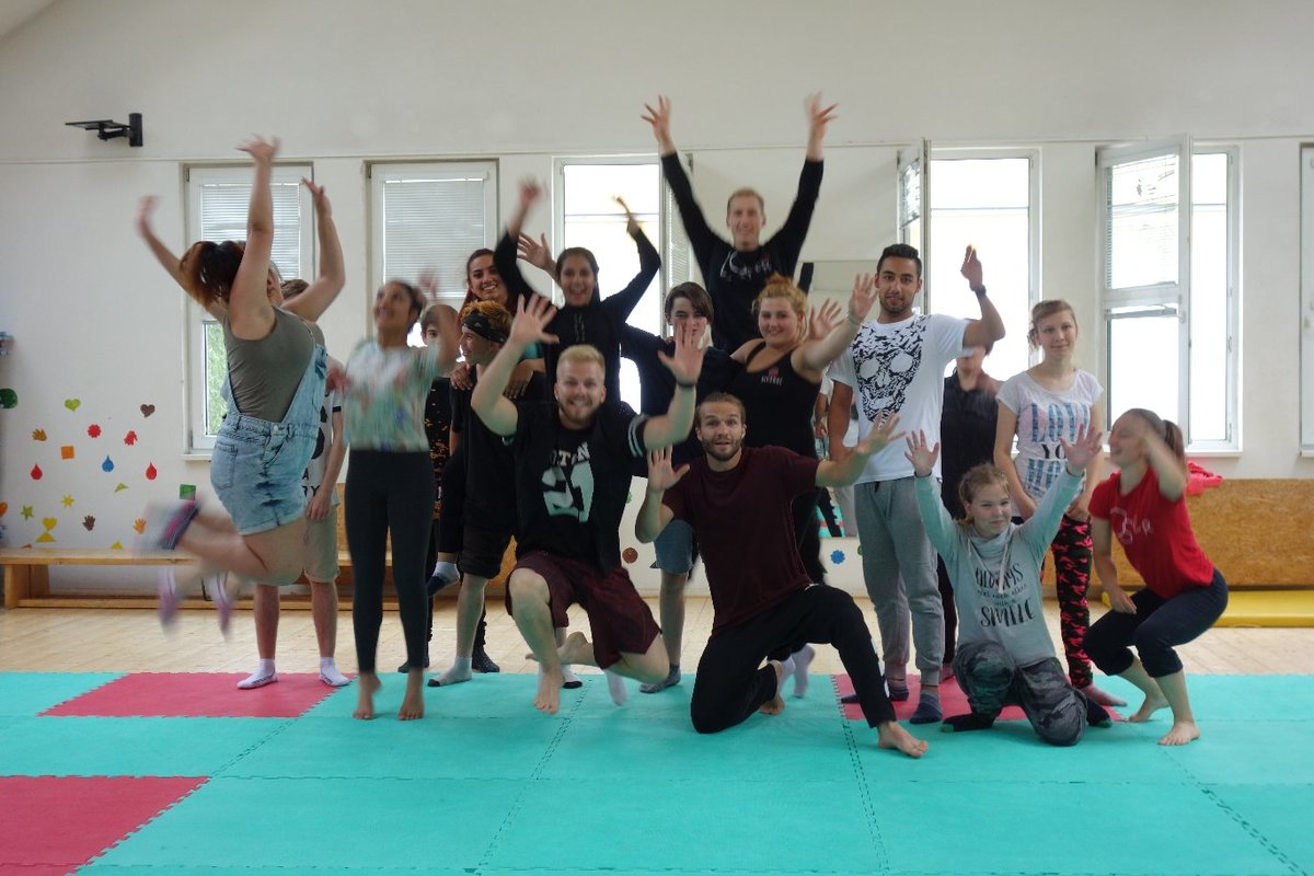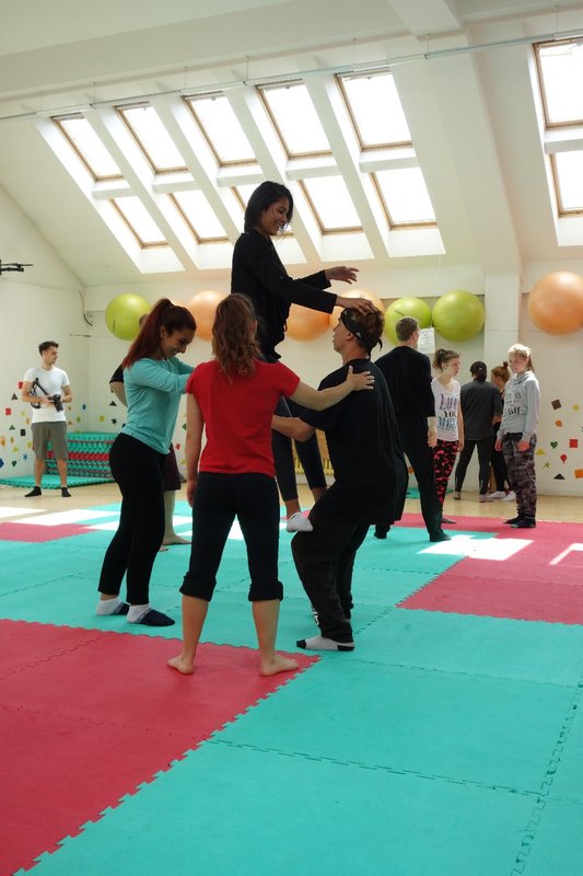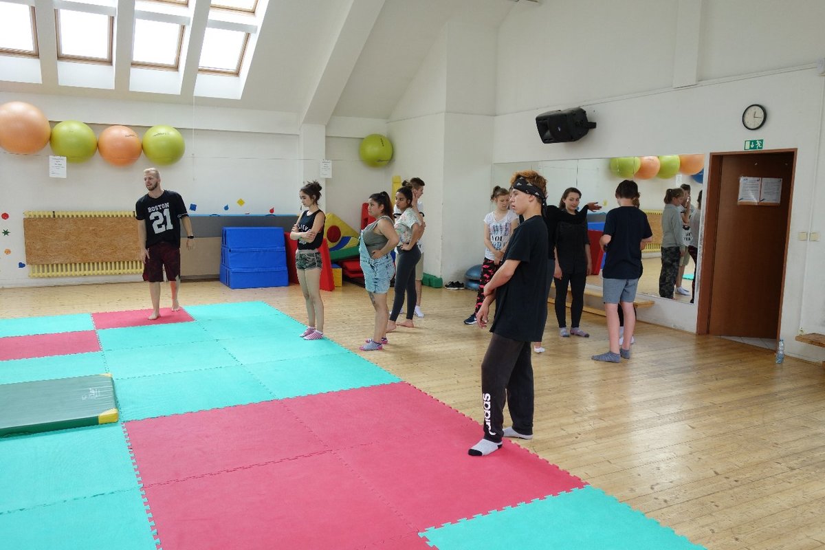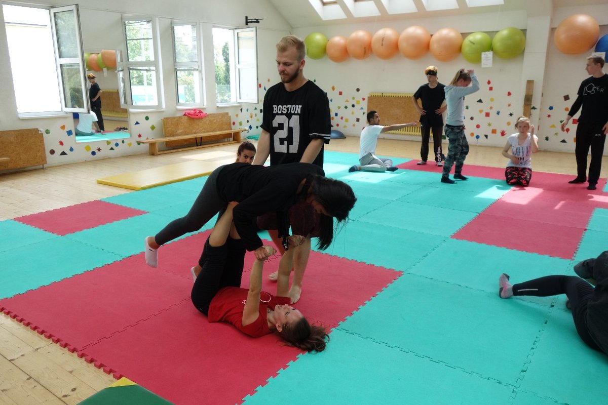Očekávaný den D nadešel, účastníci z řad dětských domovů zdárně dorazili do Prahy a nadšeně se vrhli na své, nyní již známé, trenéry. Po bouřlivém přivítání následovalo krátké protažení a poté se již děti ponořily do víru tance, po kterém následovala akrobatická část. Ta se občas neobešla bez výkřiků některých děvčat a nutno dodat, že se ne vždy jednalo o výkřiky čisté radosti – občas v nich byla znát lehká obava a adrenalin, ale šikovní a trpěliví trenéři si poradili v každé situaci 🙂