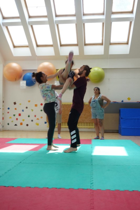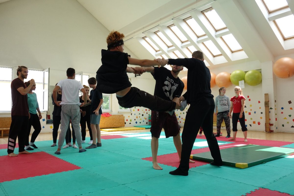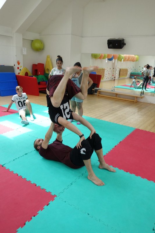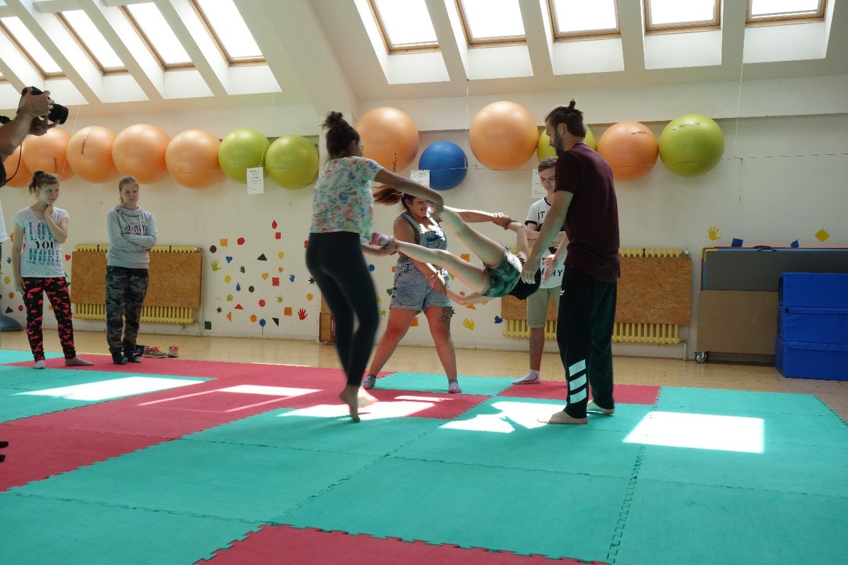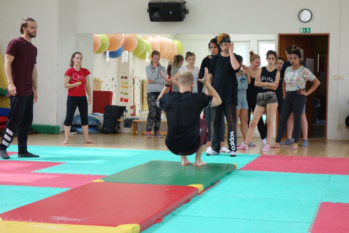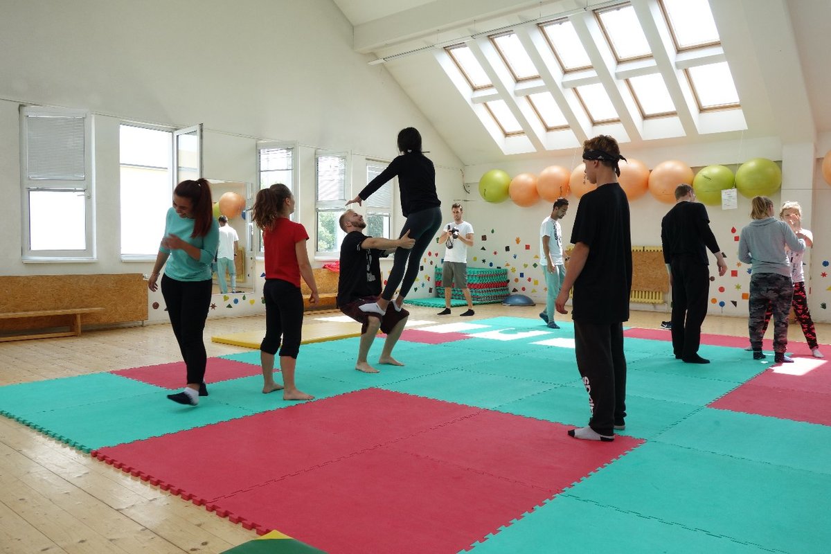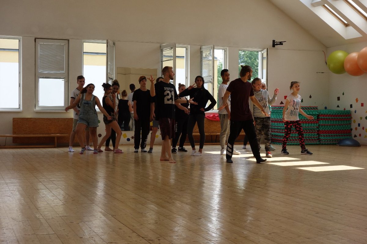Očekávaný den D nadešel, účastníci z řad dětských domovů zdárně dorazili do Prahy a nadšeně se vrhli na své, nyní již známé, trenéry. Po bouřlivém přivítání následovalo krátké protažení a poté se již děti ponořily do víru tance, po kterém následovala akrobatická část. Ta se občas neobešla bez výkřiků některých děvčat a nutno dodat, že se ne vždy jednalo o výkřiky čisté radosti – občas v nich byla znát lehká obava a adrenalin, ale šikovní a trpěliví trenéři si poradili v každé situaci 🙂