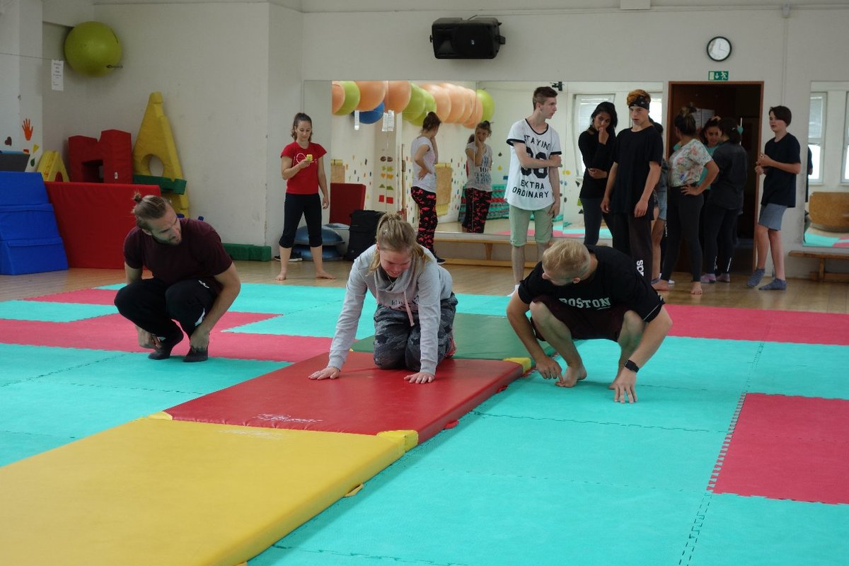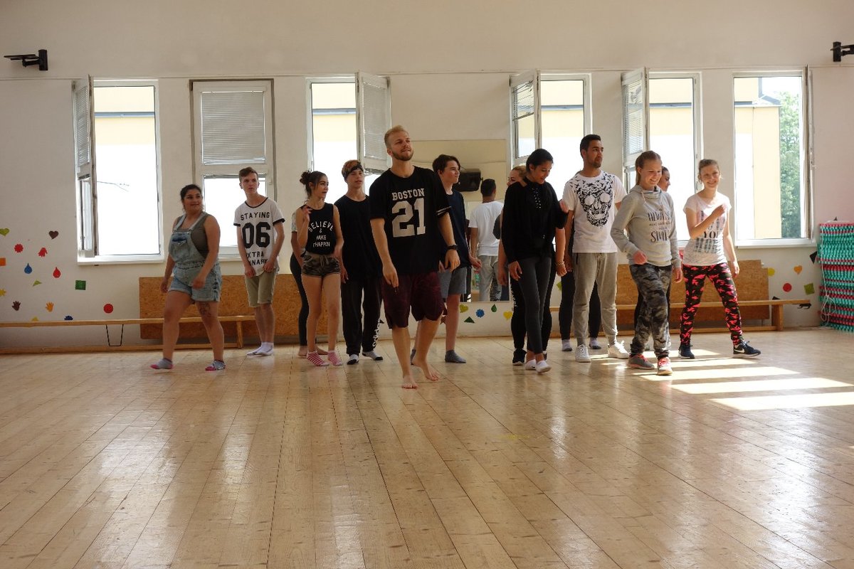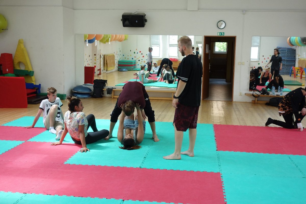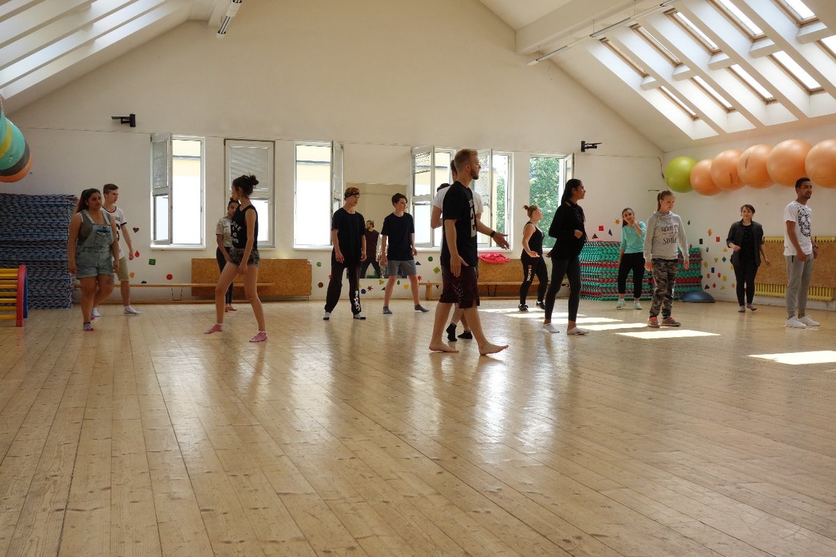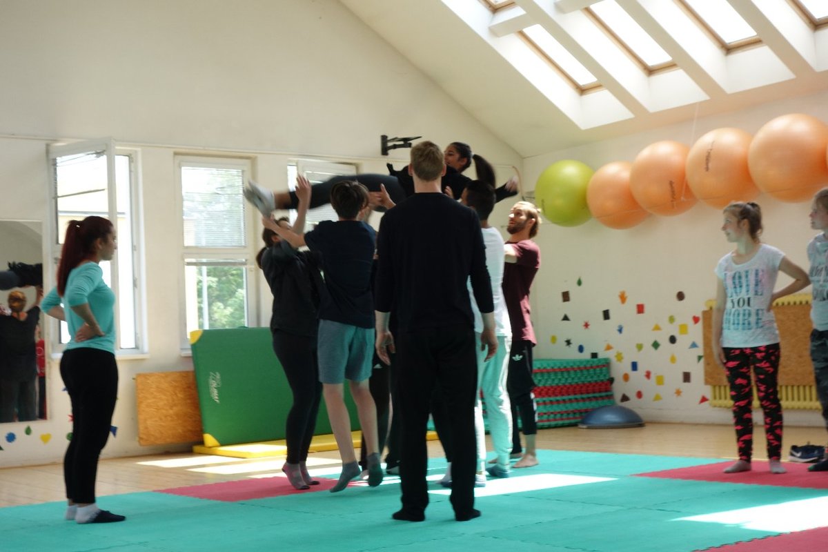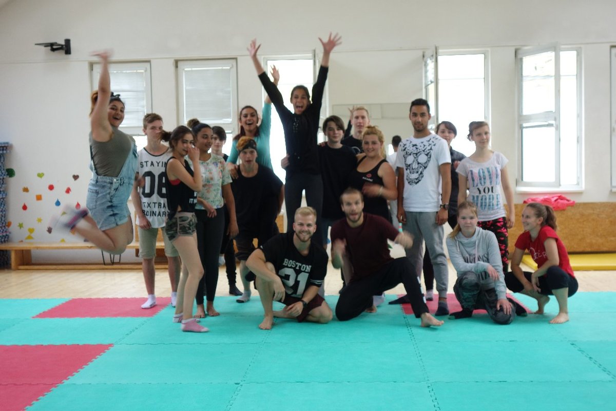 Očekávaný den D nadešel, účastníci z řad dětských domovů zdárně dorazili do Prahy a nadšeně se vrhli na své, nyní již známé, trenéry. Po bouřlivém přivítání následovalo krátké protažení a poté se již děti ponořily do víru tance, po kterém následovala akrobatická část. Ta se občas neobešla bez výkřiků některých děvčat a nutno dodat, že se ne vždy jednalo o výkřiky čisté radosti – občas v nich byla znát lehká obava a adrenalin, ale šikovní a trpěliví trenéři si poradili v každé situaci 🙂