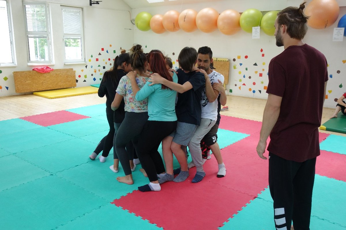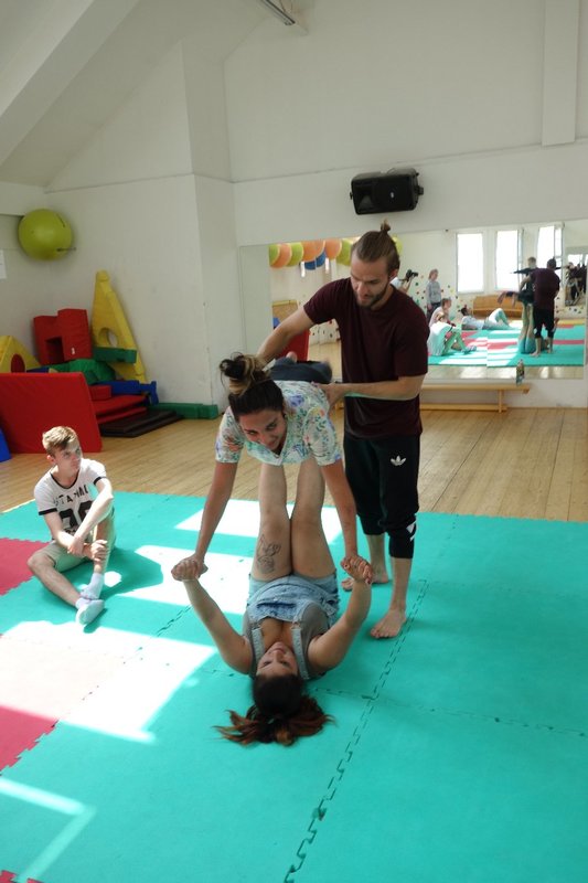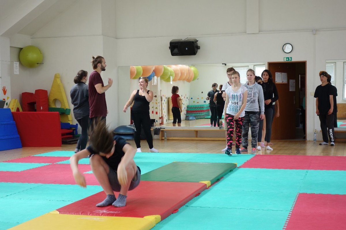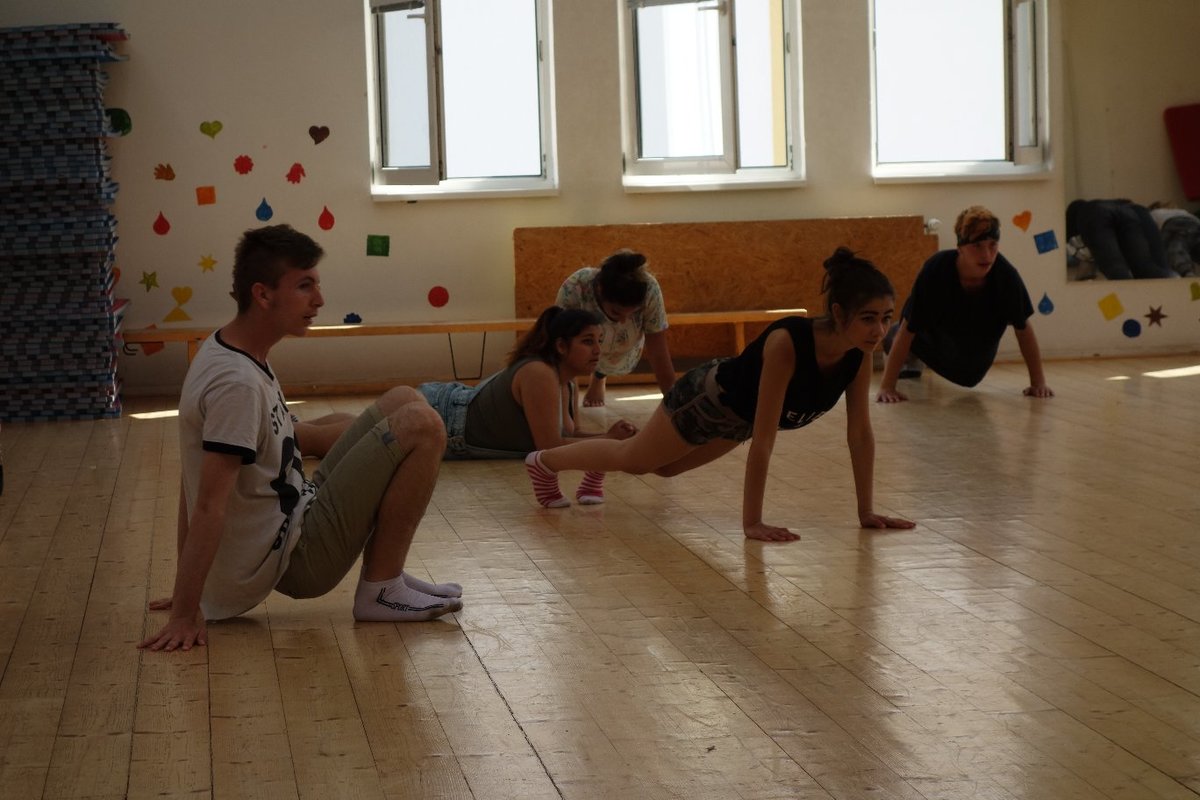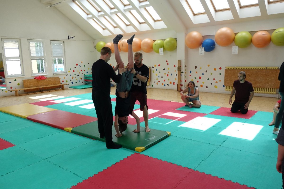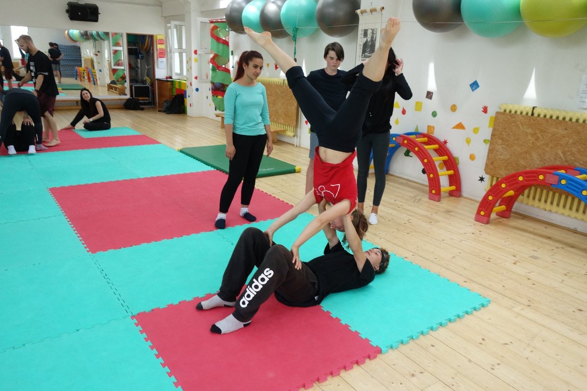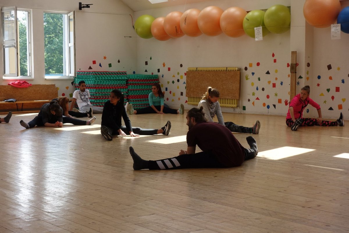 Očekávaný den D nadešel, účastníci z řad dětských domovů zdárně dorazili do Prahy a nadšeně se vrhli na své, nyní již známé, trenéry. Po bouřlivém přivítání následovalo krátké protažení a poté se již děti ponořily do víru tance, po kterém následovala akrobatická část. Ta se občas neobešla bez výkřiků některých děvčat a nutno dodat, že se ne vždy jednalo o výkřiky čisté radosti – občas v nich byla znát lehká obava a adrenalin, ale šikovní a trpěliví trenéři si poradili v každé situaci 🙂