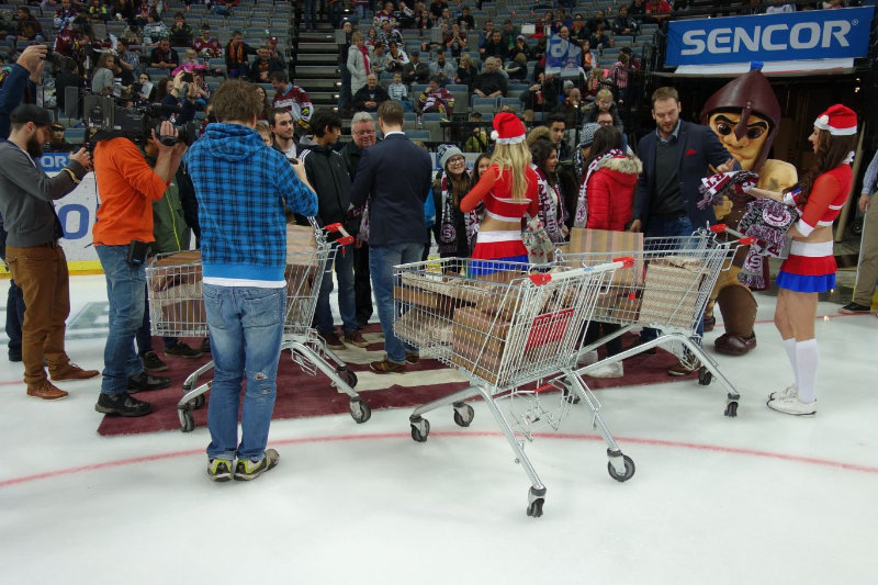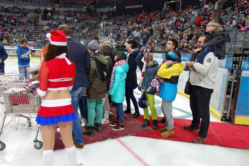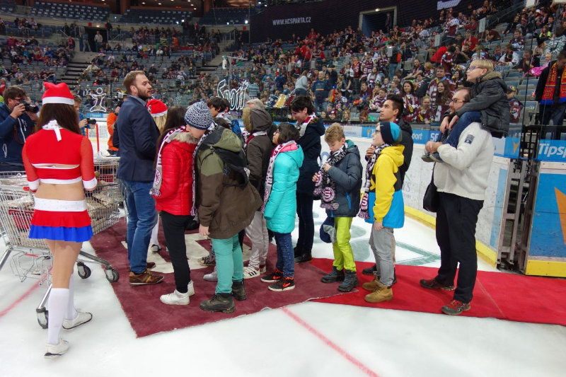 Ve druhé přestávce převzaly děti z těchto tří domovů dárky od hráčů HC Sparta Praha přímo na ledové ploše, Vít Šubert po krátkém rozhovoru převzal nový tablet.